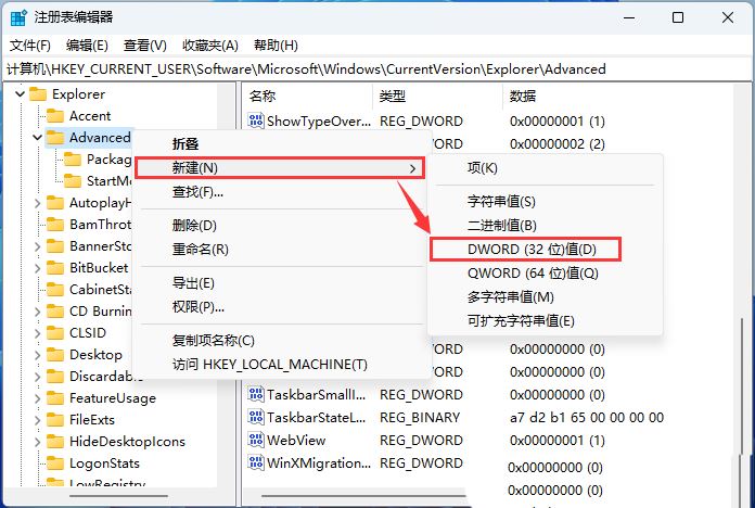 3. 【 右键】点击【 Advanced】,在打开的菜单项中,选择【 新建 - DWORD (32 位)值(D)】;