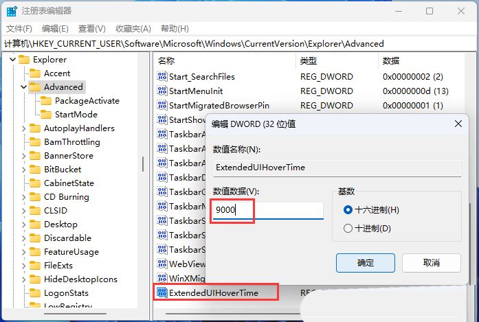 4. 新建的DWORD (32 位)值(D)命名为【 ExtendedUIHoverTime】并【 双击】打开,将数值数据修改为【 9000】;