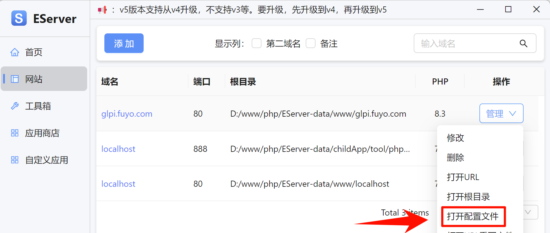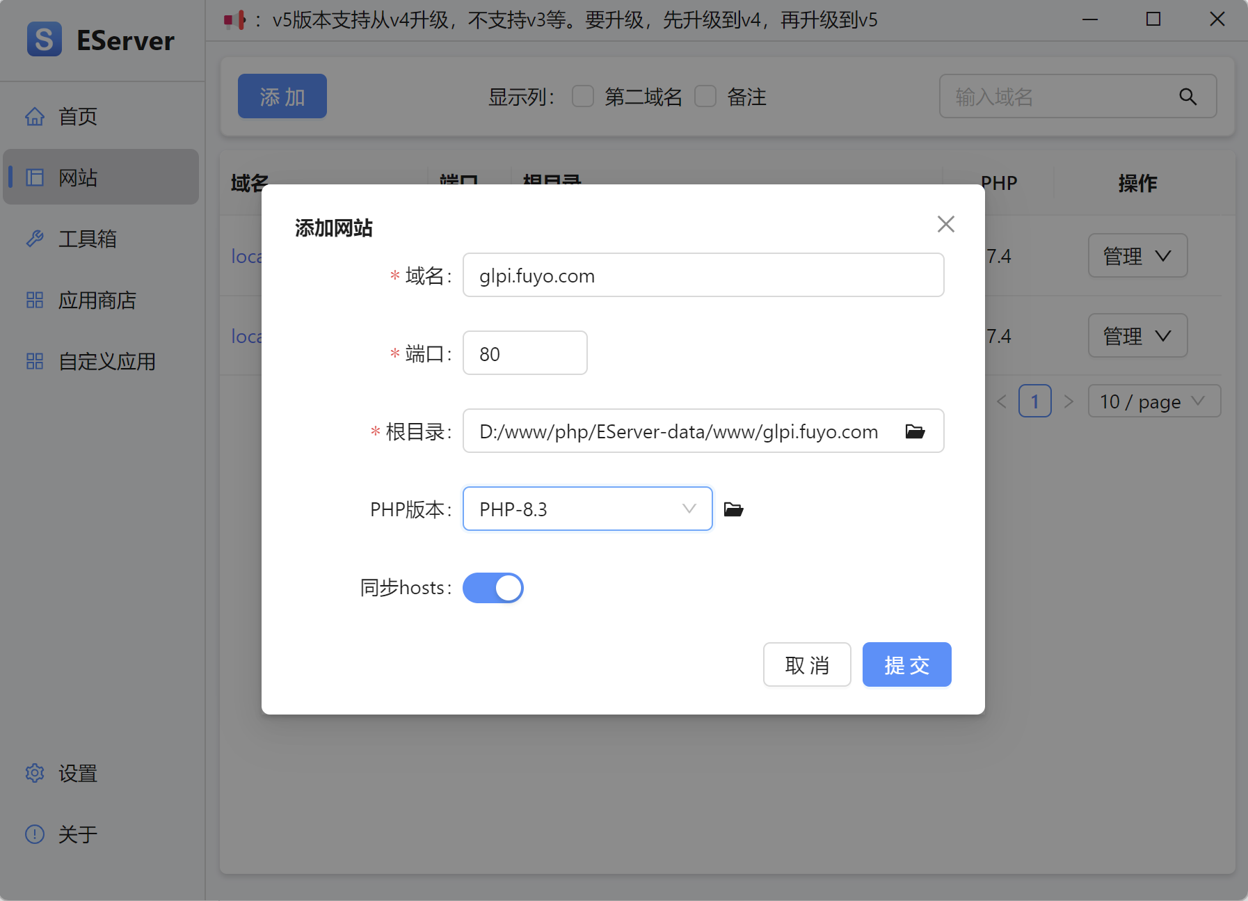 第三步:新建EServer的虚拟站点,域名为 glpi.fuyo.com,自动添加到本地hosts。把GLPI的PHP代码拷贝到路径 D:/www/php/EServer-data/www/glpi.fuyo.com/