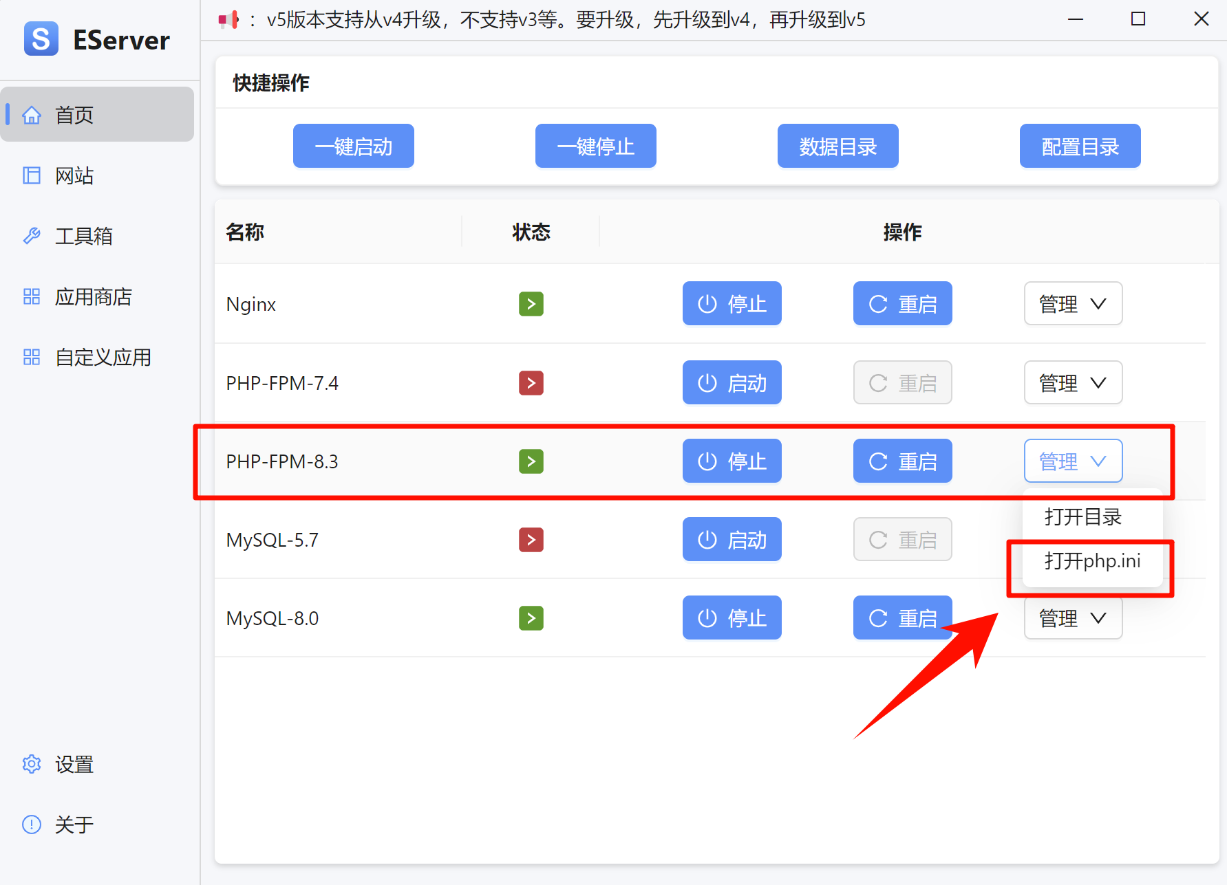 ,回到 EServer界面,重启 PHP-FPM-8.3
