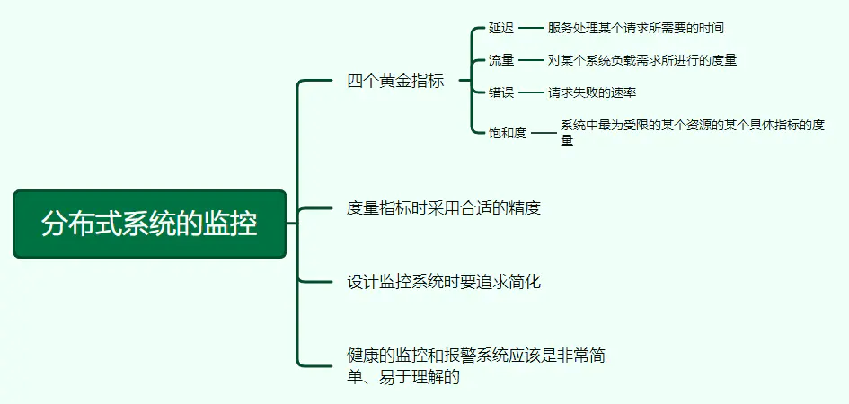 健康的监控和报警系统应该是非常简单、易于理解的。四个黄金指标是:延迟、流量、错误、饱和度。