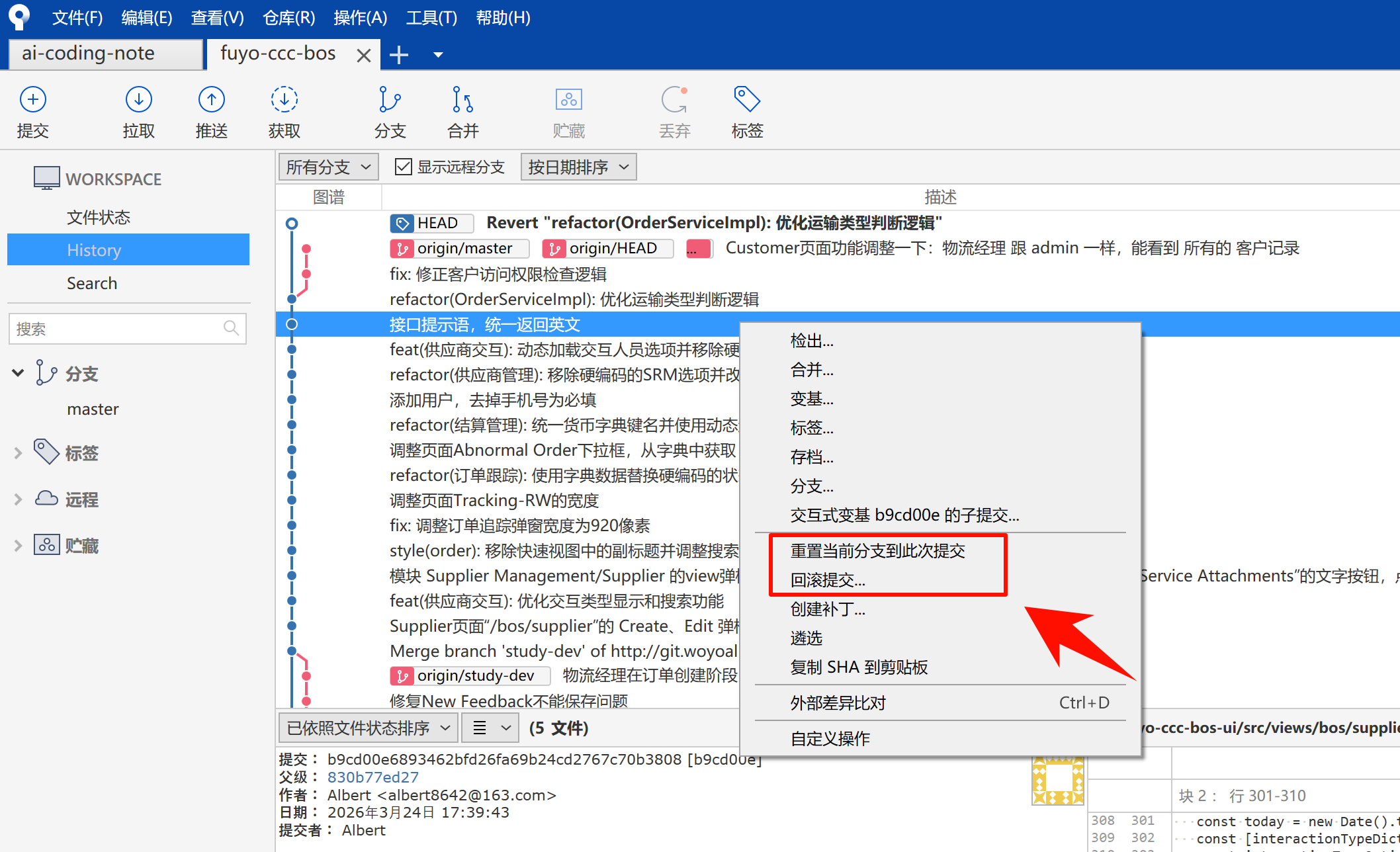 简单说:SourceTree 里的「回滚提交」= 撤销某次提交,并且生成一条新的提交记录。