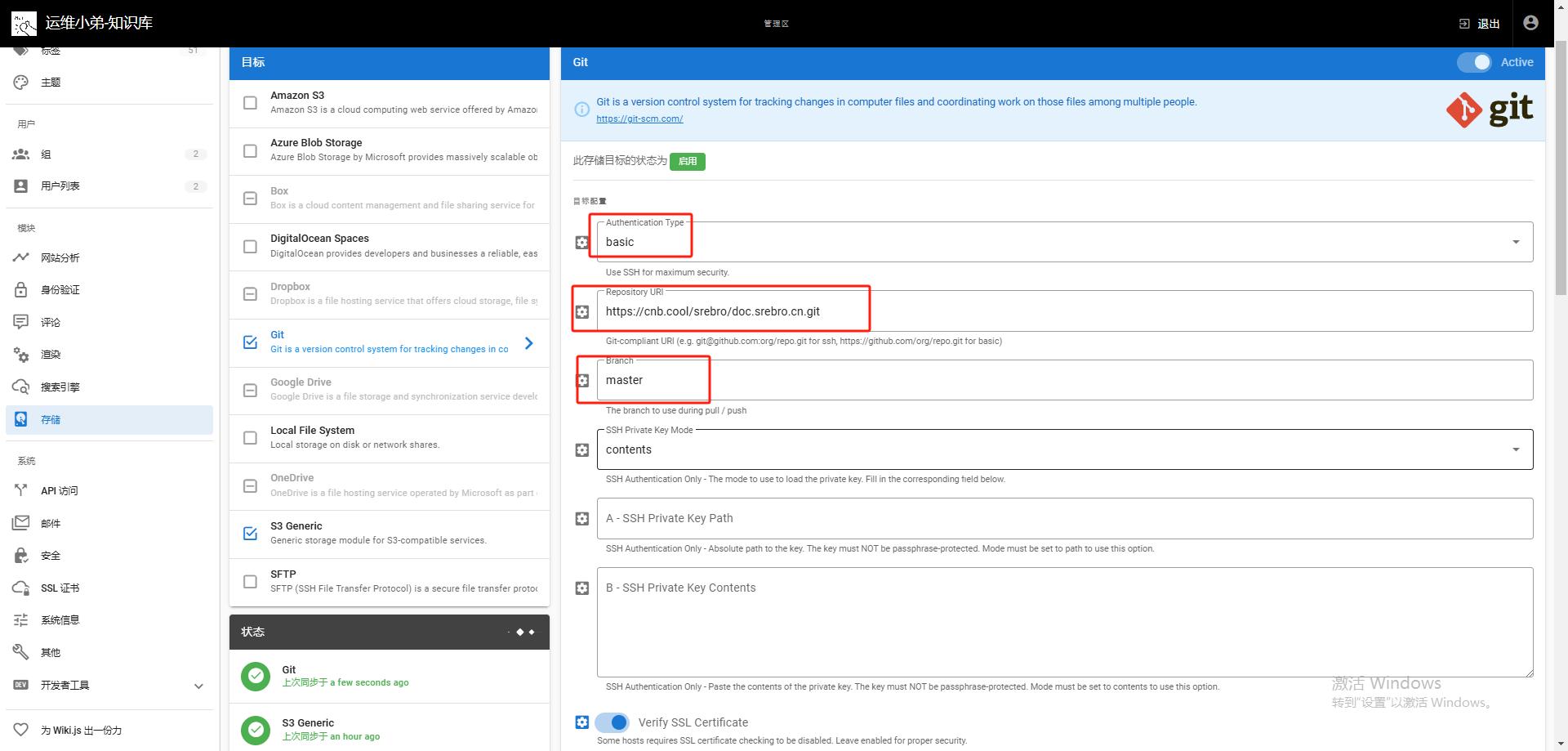 3. Wiki.js 配置(Admin → Storage → Git)